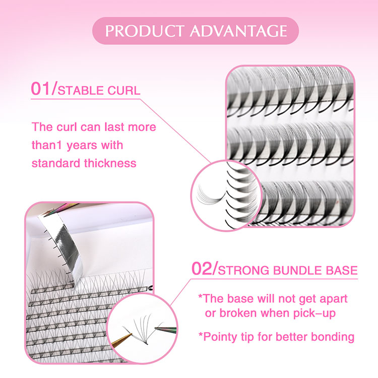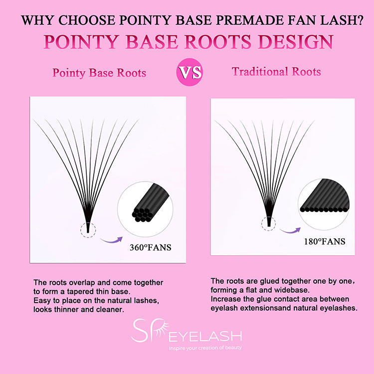 Les racines de la base de la base russe de base russe sont étroitement liées. La forme globale de la base pointue préfabriquée en forme de ventilateur de lutte russe préfabriquée russe est comme la lettre V, la base fermement liée pour former une extrémité conique nette. Ce design innovant rend les cils étendus plus minces et plus naturels, ressemblant à de vrais cils poussant naturellement à partir des racines, améliorant la beauté globale.
